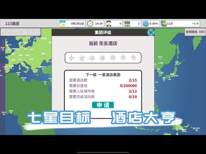 - 客户服务与声望运营:接待不同类型客群(商务人士、家庭游客、高端 VIP),通过触屏完成个性化服务:为商务客升级高速网络,为家庭客增设儿童游乐区,为 VIP 提供专属管家服务。客户评价决定酒店星级(1-5 星),星级达标可解锁稀有设施(如博物馆级画廊、人工湖景观);向银行贷款可快速扩张,但逾期未还将降低信用评级,影响合作资源获取。